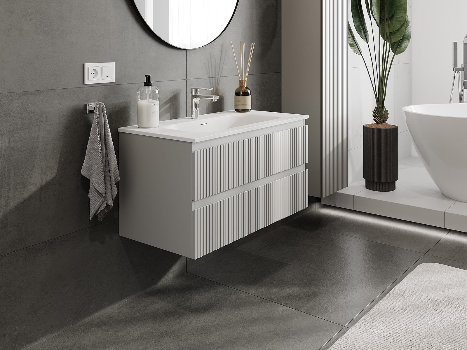 Unsere modularen Badezimmermöbel können in verschiedenen Farbkonfigurationen miteinander kombiniert werden, wodurch eine vollständige Personalisierung ermöglicht wird. Man kann sowohl das Aussehen als auch die Funktionen der einzelnen Elemente auswählen, was es erlaubt, die Möbel an eigene stilistische und funktionale Vorlieben anzupassen.