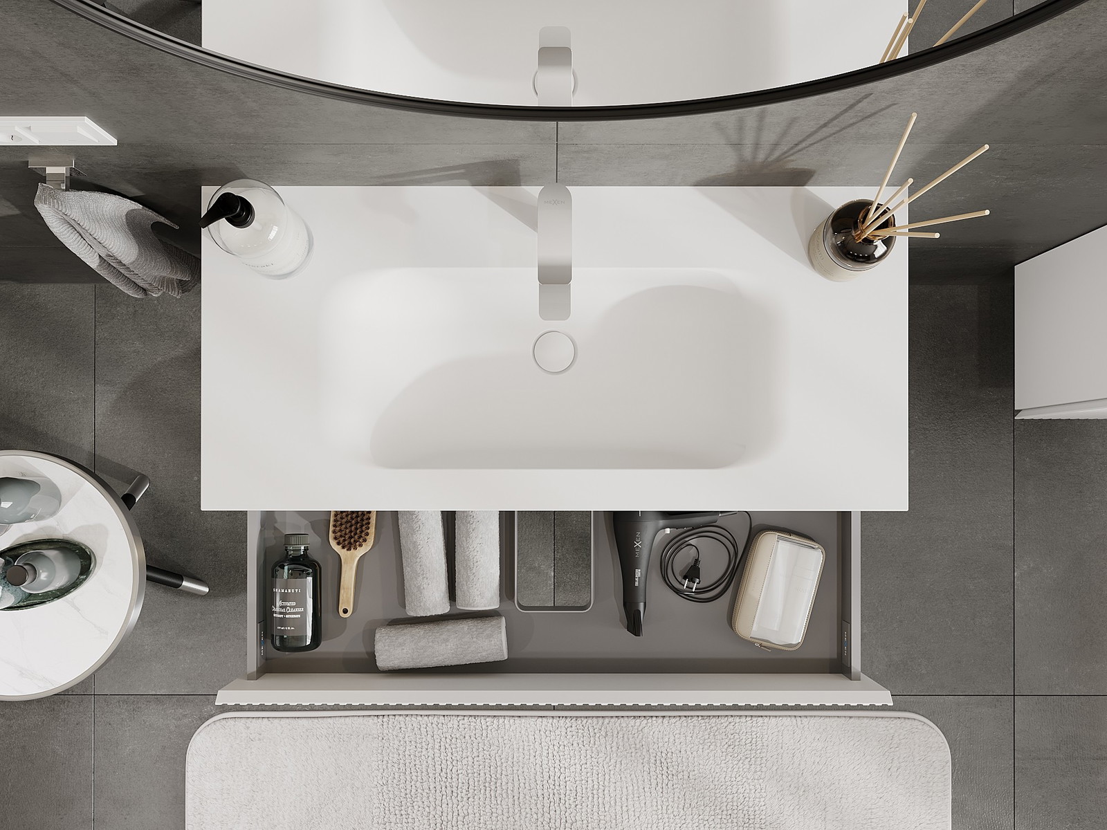 Unsere modularen Badezimmermöbel können in verschiedenen Farbkonfigurationen miteinander kombiniert werden, wodurch eine vollständige Personalisierung ermöglicht wird. Man kann sowohl das Aussehen als auch die Funktionen der einzelnen Elemente auswählen, was es erlaubt, die Möbel an eigene stilistische und funktionale Vorlieben anzupassen.