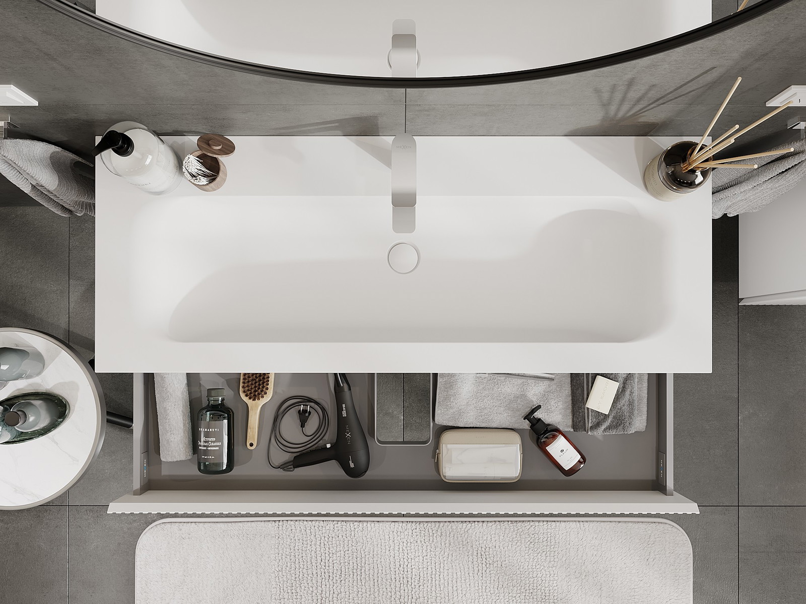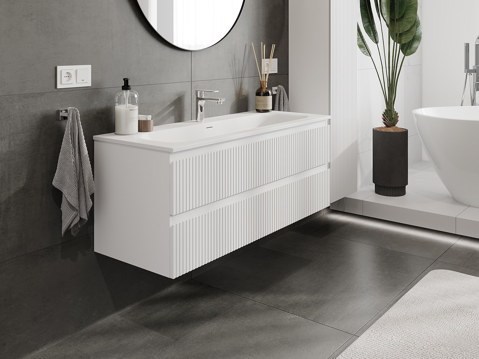 Unsere modularen Badezimmermöbel können in verschiedenen Farbkonfigurationen miteinander kombiniert werden, wodurch eine vollständige Personalisierung ermöglicht wird. Man kann sowohl das Aussehen als auch die Funktionen der einzelnen Elemente auswählen, was es erlaubt, die Möbel an eigene stilistische und funktionale Vorlieben anzupassen.