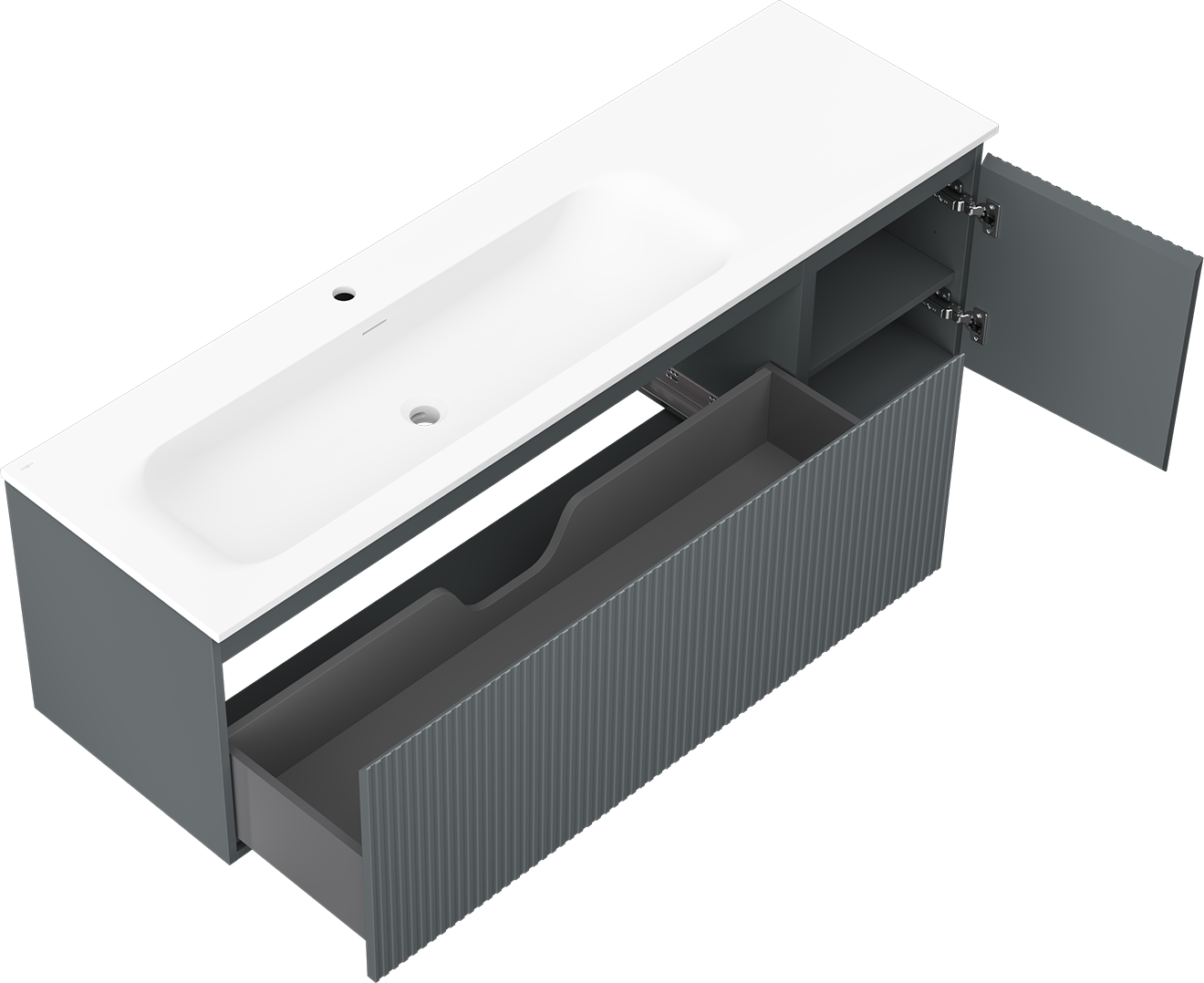 Der Ausschnitt in der Schublade ist so gestaltet, dass er den Siphon aufnehmen kann, der für Waschbeckeninstallationen erforderlich ist. Dadurch kann das Möbelstück voll funktionsfähig montiert werden, ohne auf den Platz in der Schublade zugunsten der Installation verzichten zu müssen.