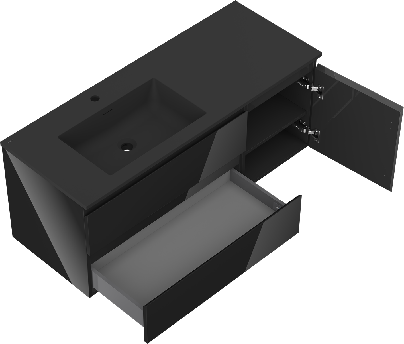 Der Ausschnitt in der Schublade ist so gestaltet, dass er den Siphon aufnehmen kann, der für Waschbeckeninstallationen erforderlich ist. Dadurch kann das Möbelstück voll funktionsfähig montiert werden, ohne auf den Platz in der Schublade zugunsten der Installation verzichten zu müssen.