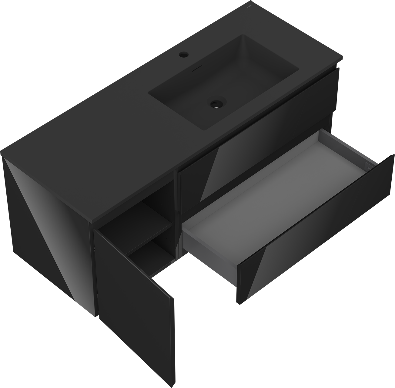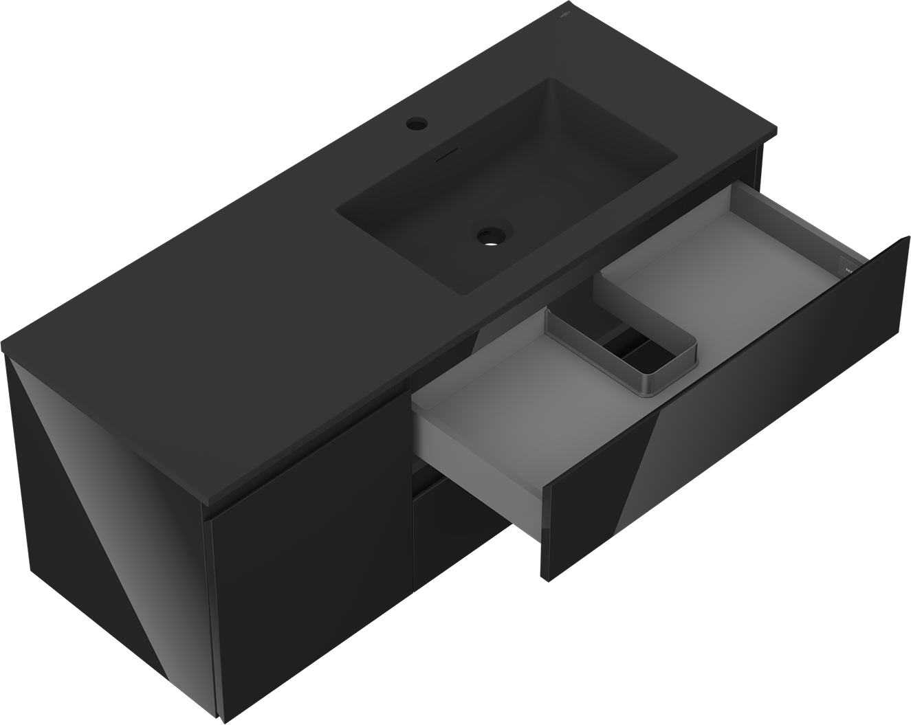 Der Ausschnitt in der Schublade ist so gestaltet, dass er den Siphon aufnehmen kann, der für Waschbeckeninstallationen erforderlich ist. Dadurch kann das Möbelstück voll funktionsfähig montiert werden, ohne auf den Platz in der Schublade zugunsten der Installation verzichten zu müssen.