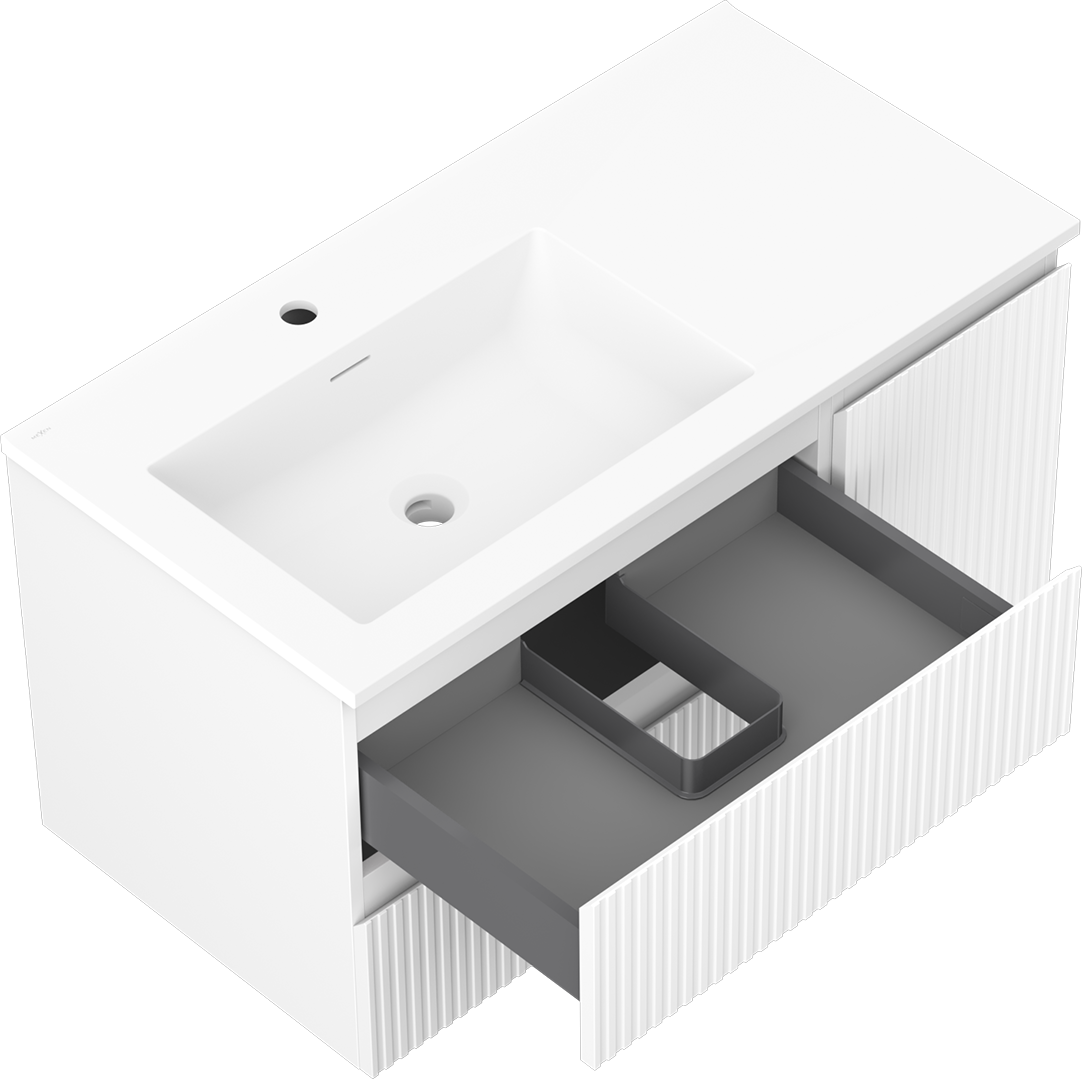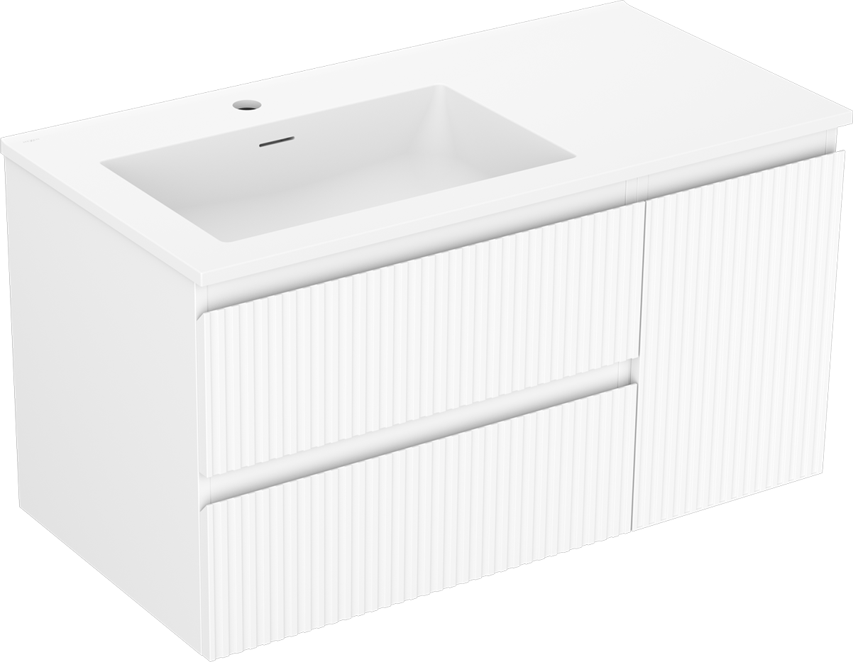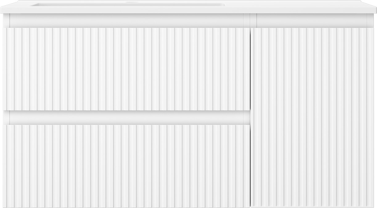 Mexen Rivel Badezimmerschrank 90 cm mit linkem Waschbecken Otis, 2S, 1D, gerillt, weiß matt - 91A23-09047-3-BBFFF01-W18L01