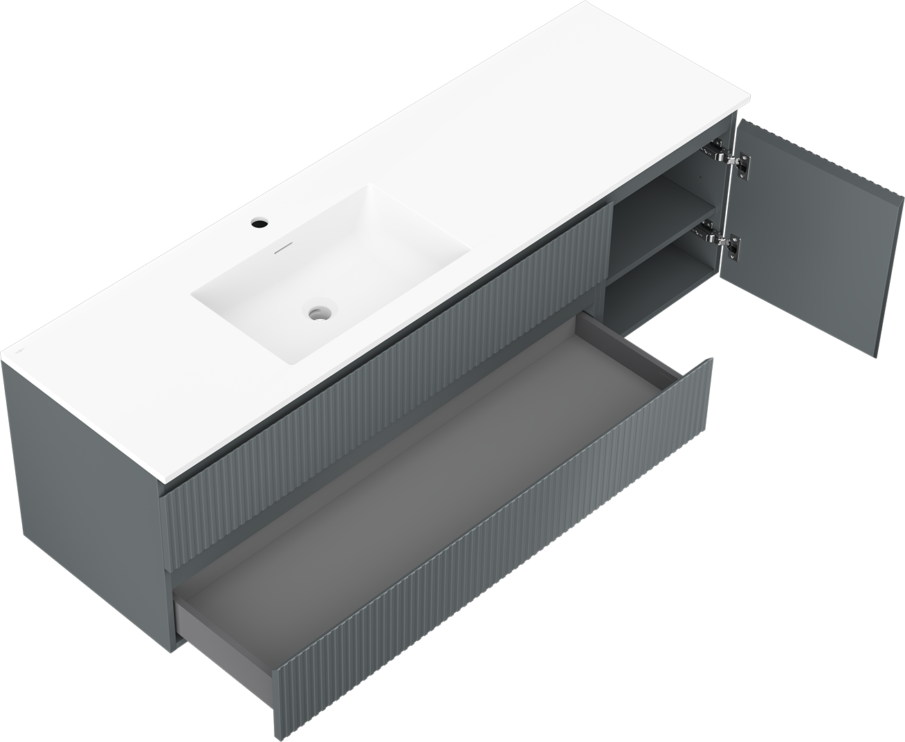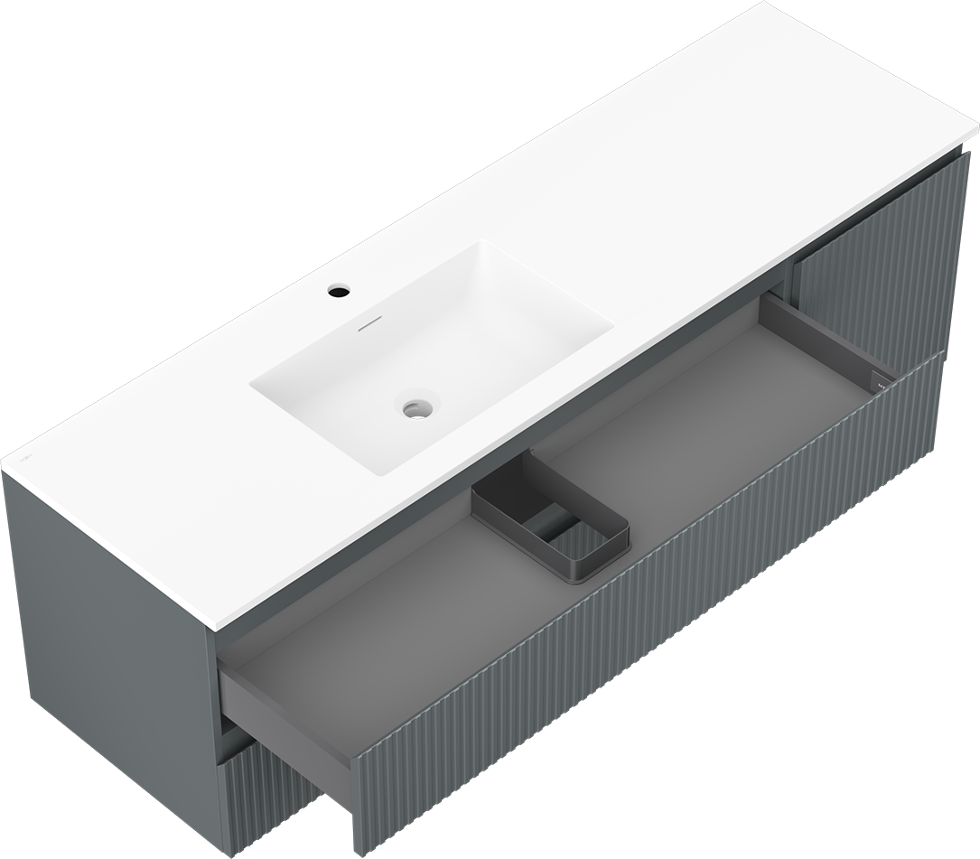 Der Ausschnitt in der Schublade ist so gestaltet, dass er den Siphon aufnehmen kann, der für Waschbeckeninstallationen erforderlich ist. Dadurch kann das Möbelstück voll funktionsfähig montiert werden, ohne auf den Platz in der Schublade zugunsten der Installation verzichten zu müssen.