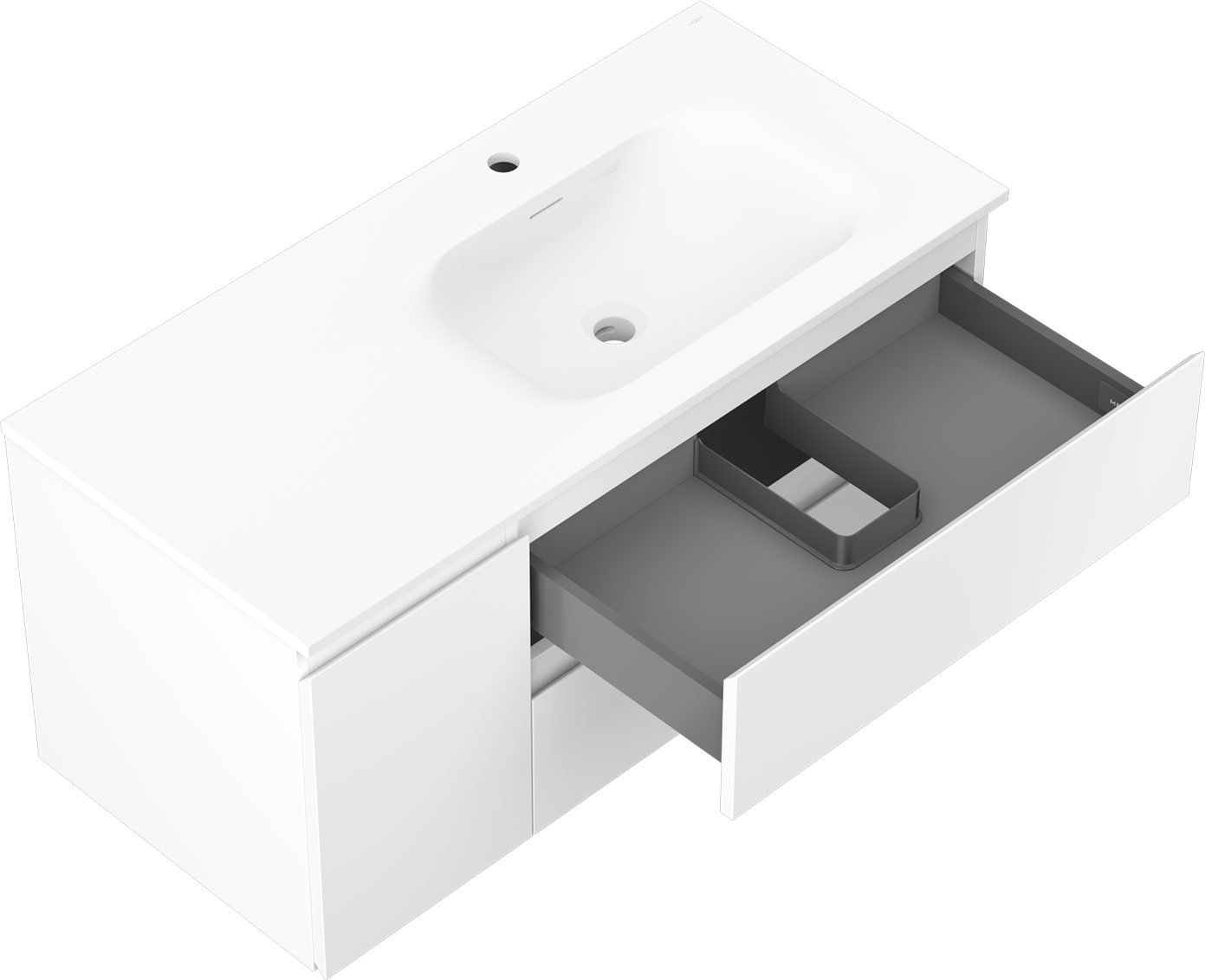 Der Ausschnitt in der Schublade ist so gestaltet, dass er den Siphon aufnehmen kann, der für Waschbeckeninstallationen erforderlich ist. Dadurch kann das Möbelstück voll funktionsfähig montiert werden, ohne auf den Platz in der Schublade zugunsten der Installation verzichten zu müssen.
