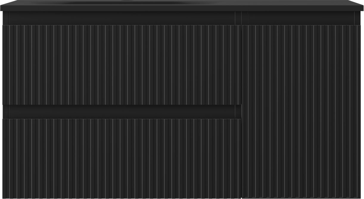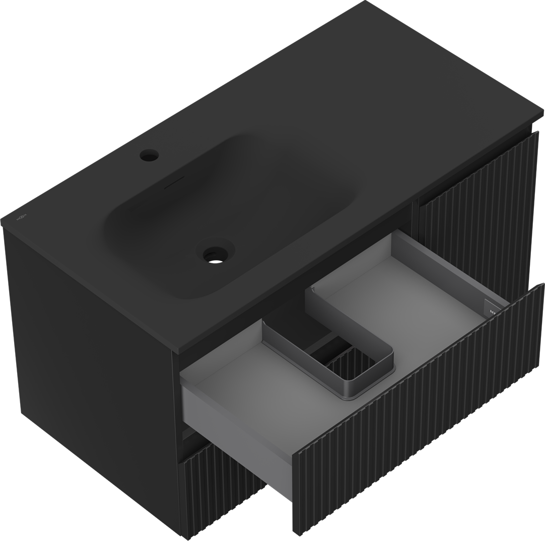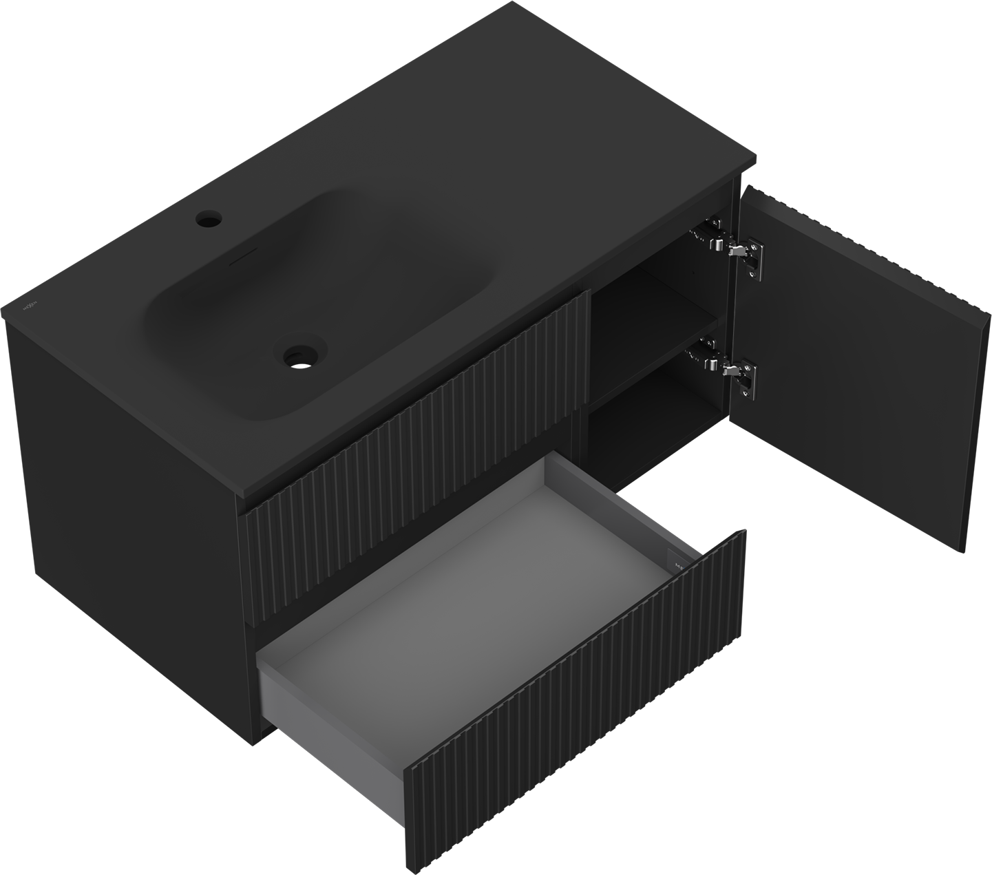 Mexen Rivel Badezimmerschrank 90 cm mit Vela-Links-Waschbecken, 2S, 1T, gerillt, schwarz matt - 91A23-09047-3-BBFFF71-W23L71