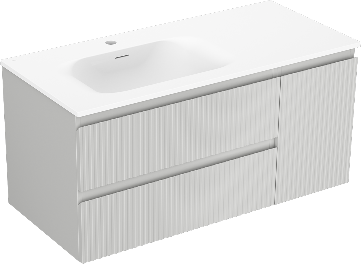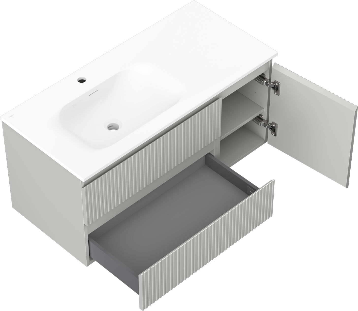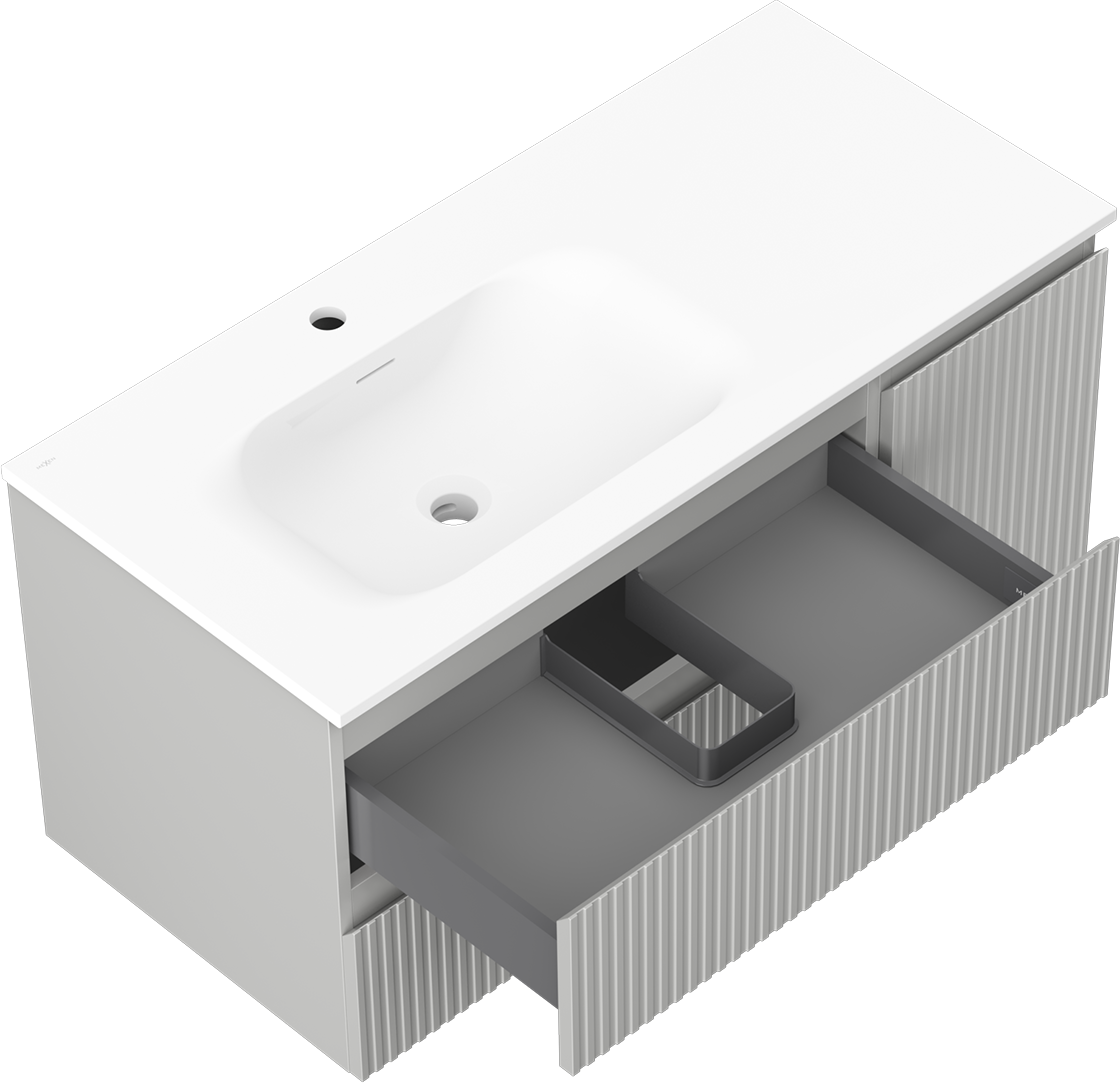 Der Ausschnitt in der Schublade ist so gestaltet, dass er den Siphon aufnehmen kann, der für Waschbeckeninstallationen erforderlich ist. Dadurch kann das Möbelstück voll funktionsfähig montiert werden, ohne auf den Platz in der Schublade zugunsten der Installation verzichten zu müssen.