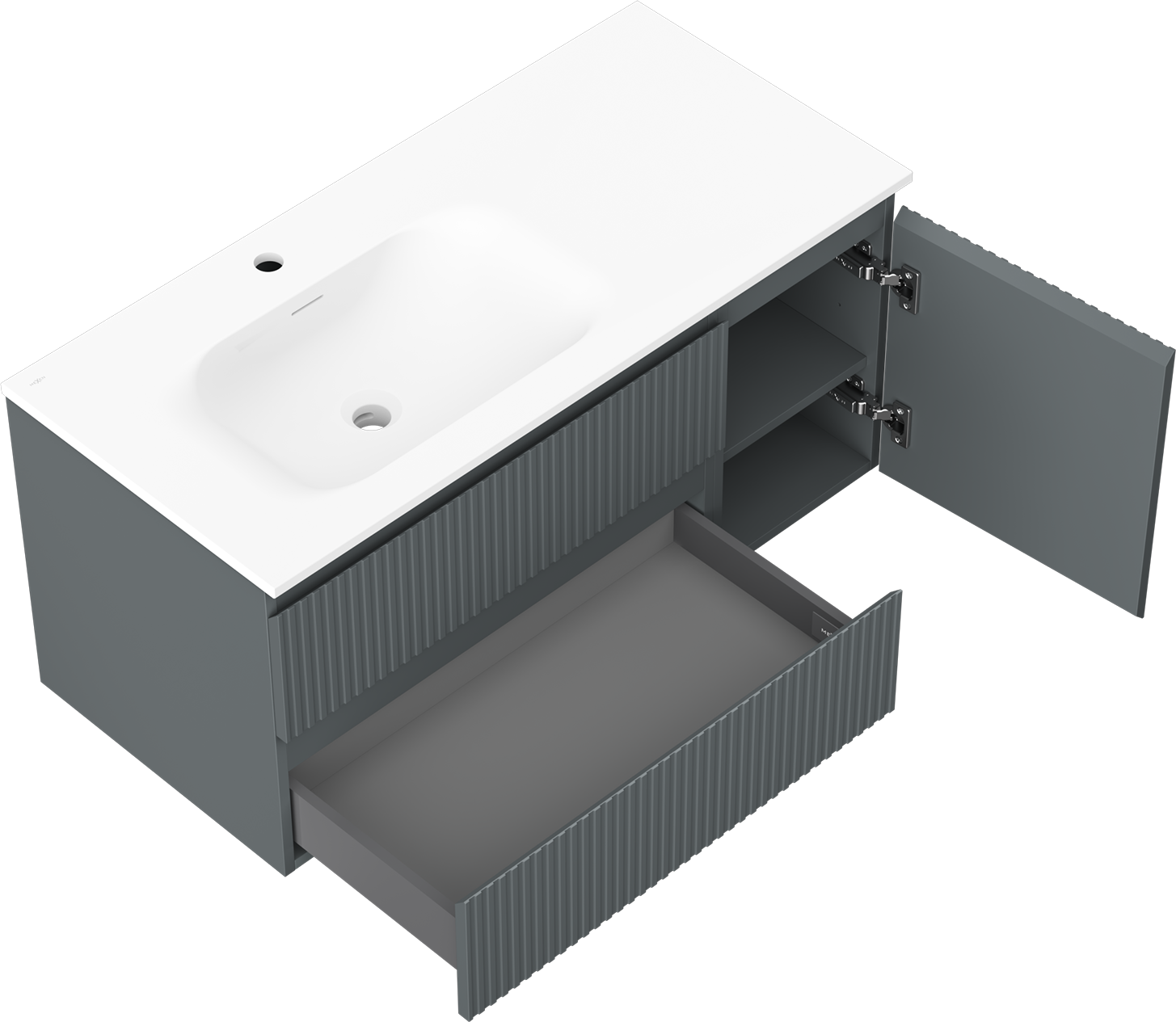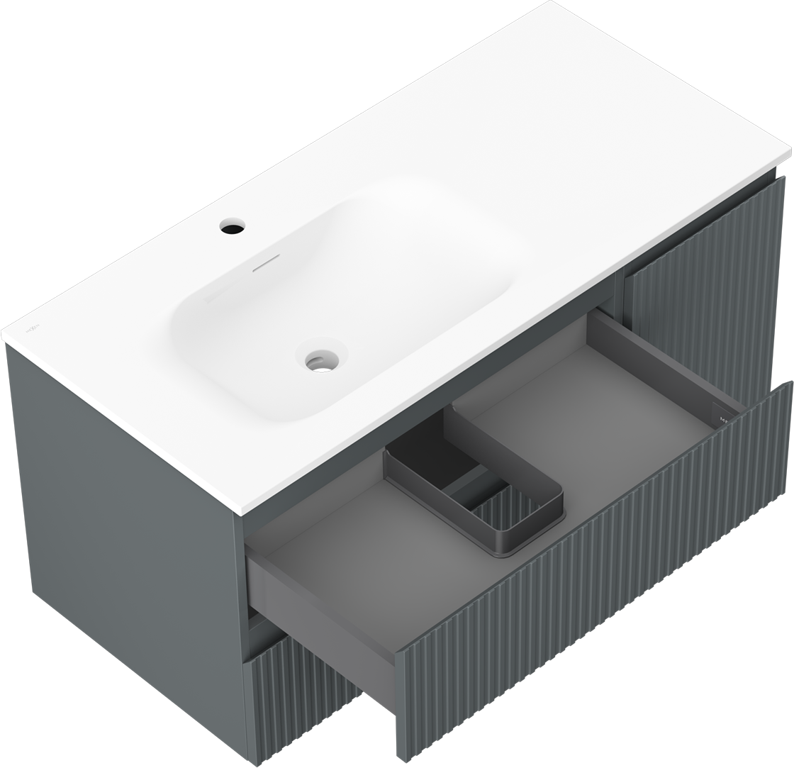 Der Ausschnitt in der Schublade ist so gestaltet, dass er den Siphon aufnehmen kann, der für Waschbeckeninstallationen erforderlich ist. Dadurch kann das Möbelstück voll funktionsfähig montiert werden, ohne auf den Platz in der Schublade zugunsten der Installation verzichten zu müssen.