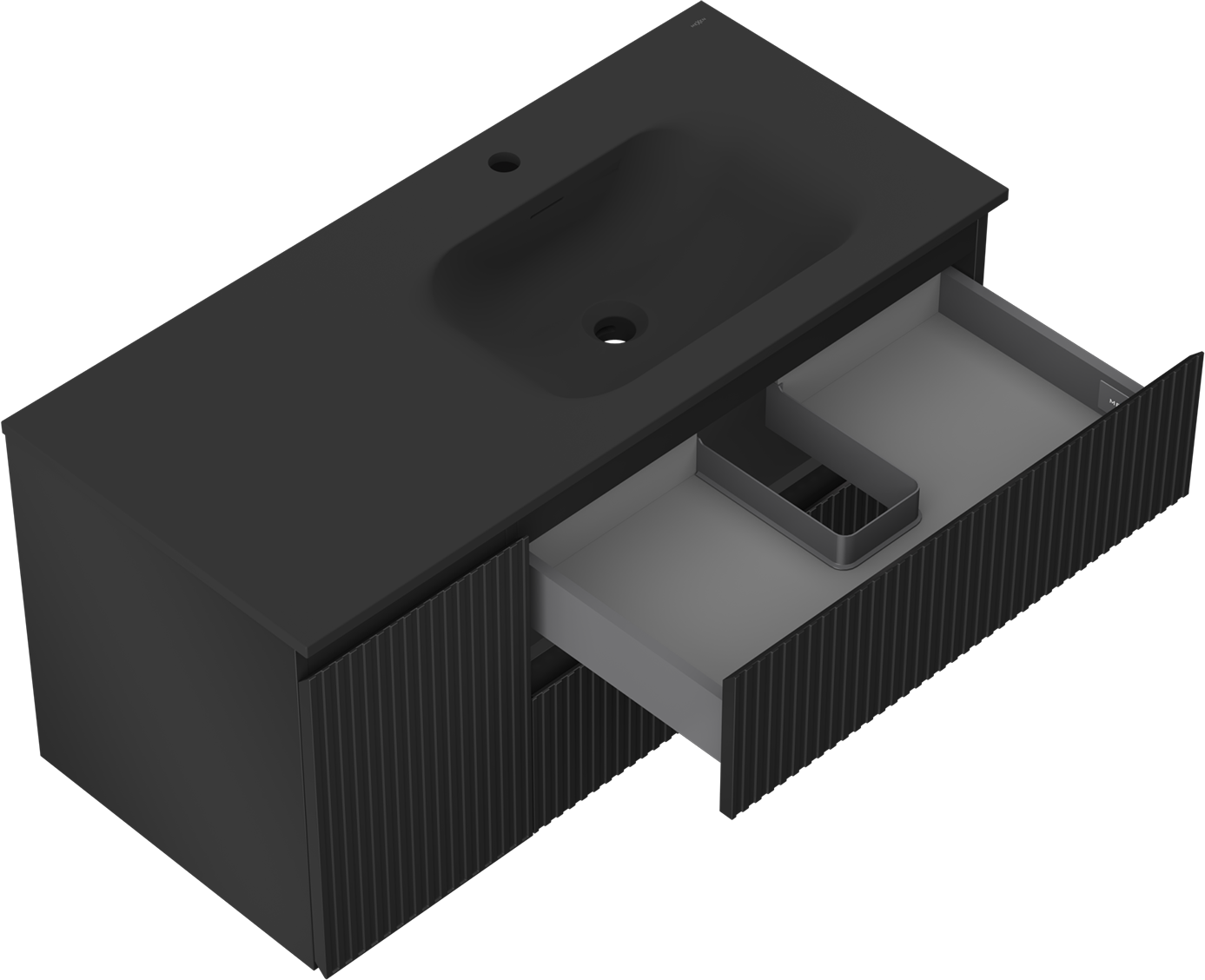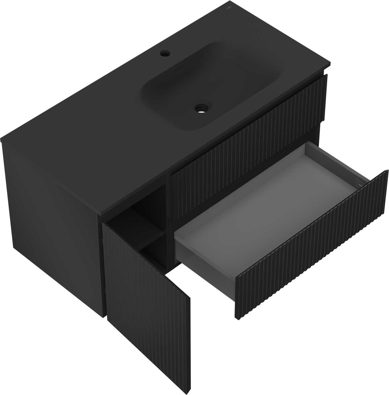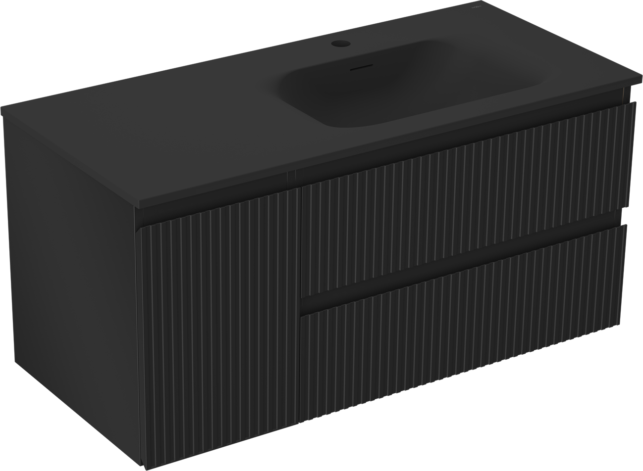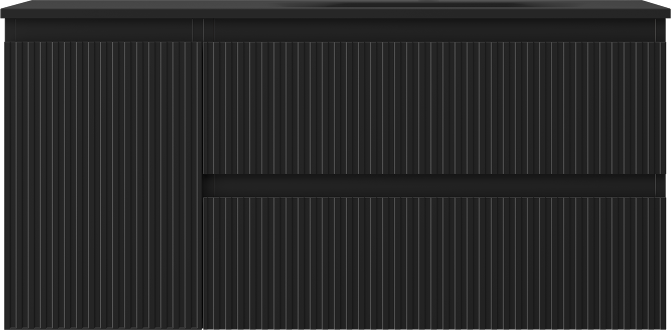 Mexen Rivel Badezimmerschrank 120 cm mit Waschbecken Vela rechts, 2S, 1D, gerillt, Schwarz matt - 91A23-10047-3-BBFFF71-W23P71