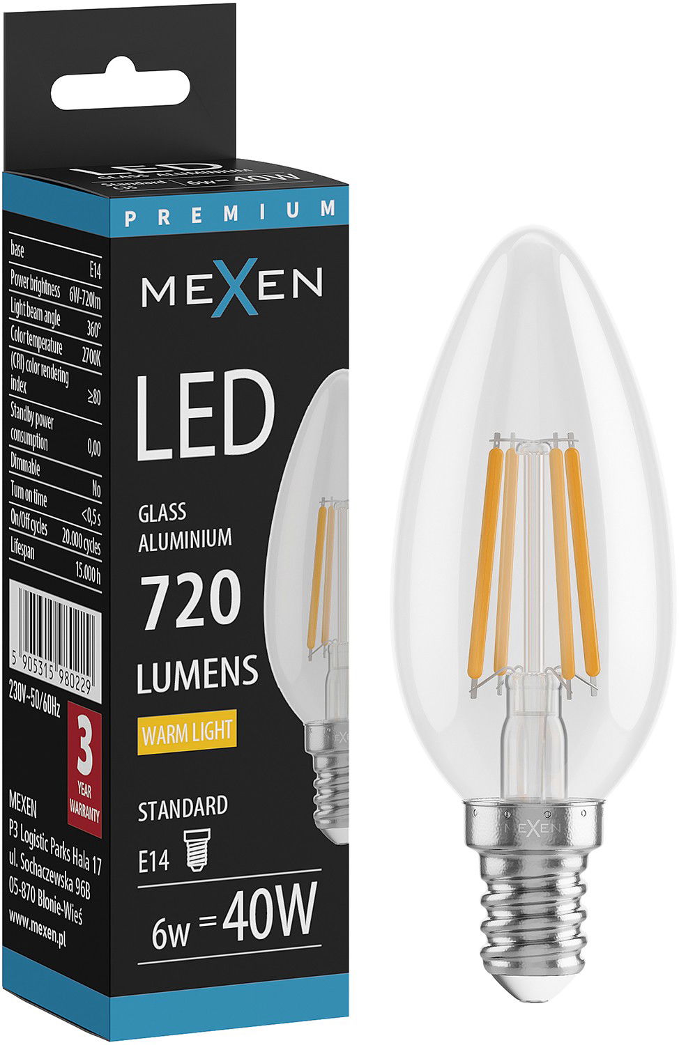 Mexen Vintis LED-Filamentlampe E14, C35, 6W, Warm - 2700K, 720 lm, klar - L154-E14-0627-00