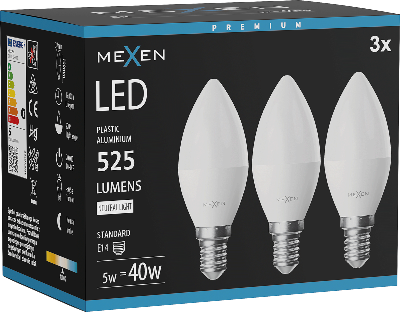 Mexen Nova 3x LED-Glühbirne E14, C37, 5W, Neutral - 4000K, 525 lm - L102-E14-0540-01x03