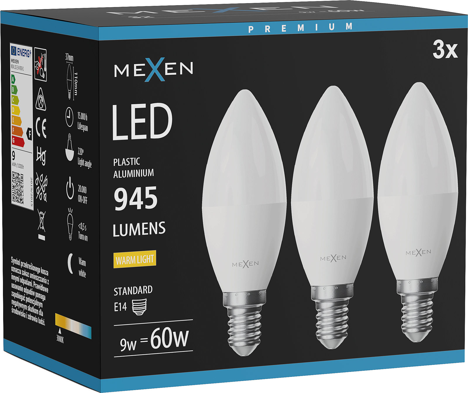 Mexen Nova 3x LED-Lampe E14, C37, 9W, Warm - 3000K, 945 lm - L102-E14-0930-01x03