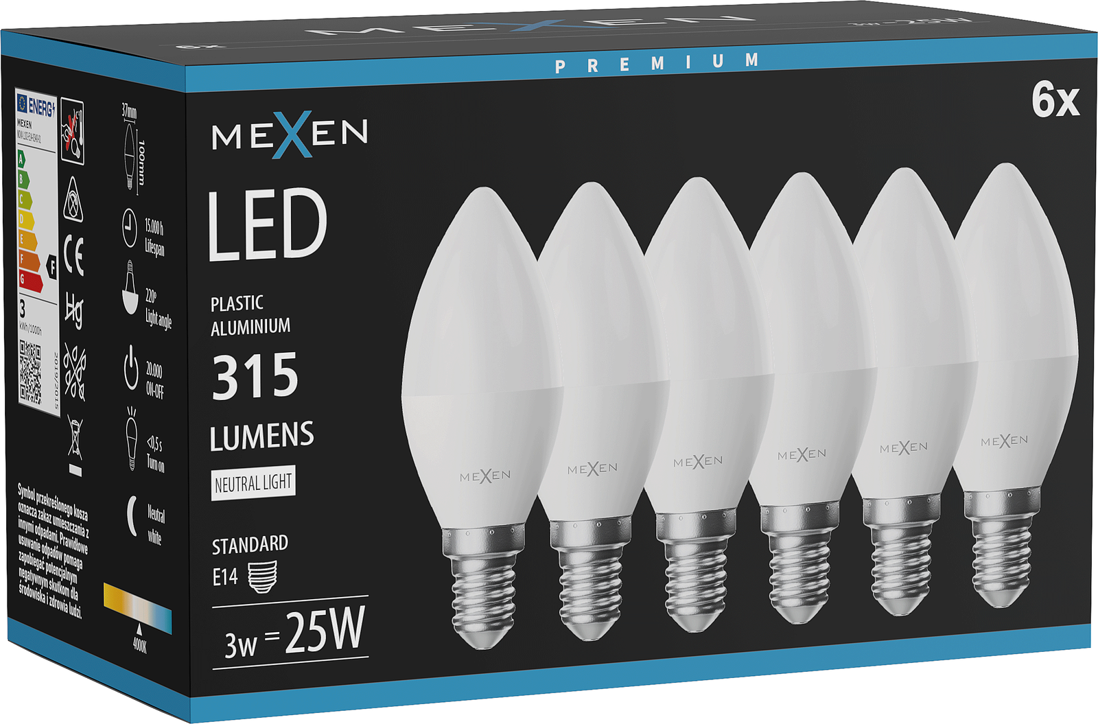 Mexen Nova 6x LED-Glühbirne E14, C37, 3W, Neutral - 4000K, 315 lm - L102-E14-0340-01x06