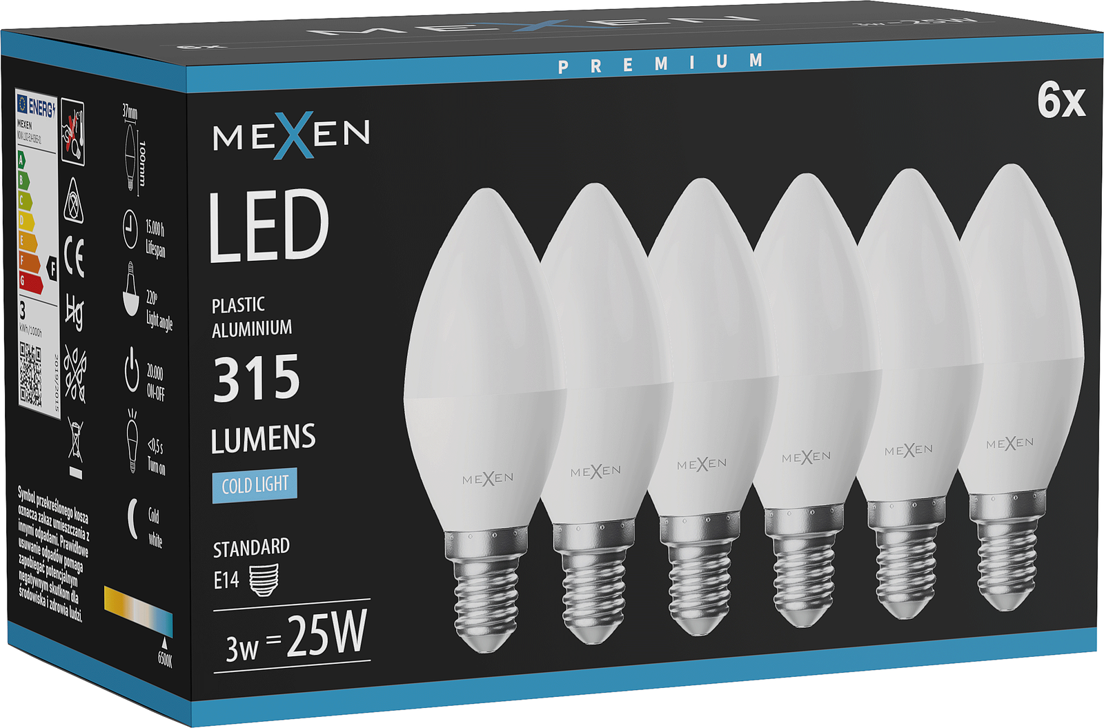 Mexen Nova 6x LED-Glühbirne E14, C37, 3W, Kalt - 6500K, 315 lm - L102-E14-0365-01x06