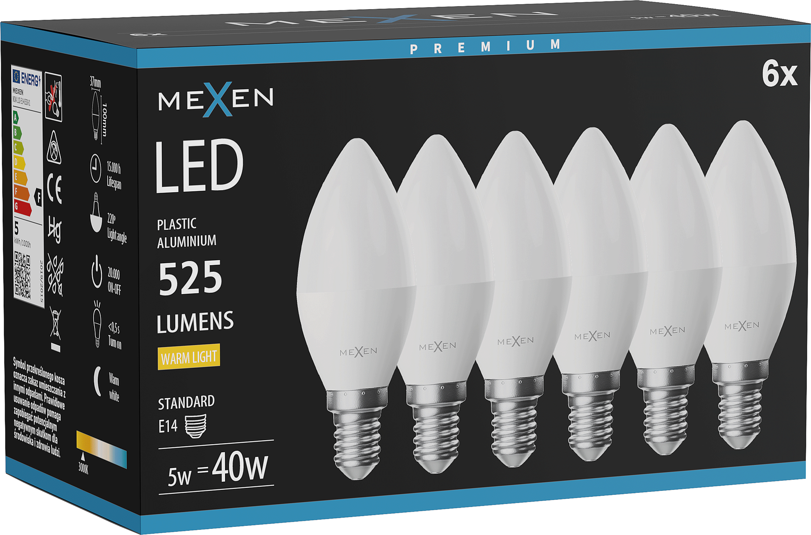 Mexen Nova 6x LED-Lampe E14, C37, 5W, Warm - 3000K, 525 lm - L102-E14-0530-01x06