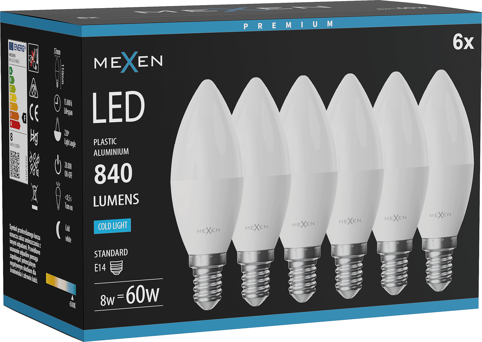 Mexen Nova 6x LED Lampe E14, C37, 8W, Kalt - 6500K, 840 lm - L102-E14-0865-01x06