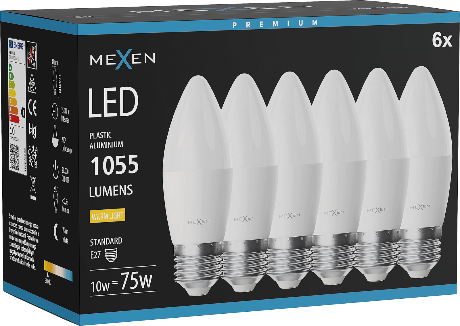 Mexen Nova 6x LED-Glühbirne E27, C37, 10W, Warm - 3000K, 1055 lm - L102-E27-1030-01x06