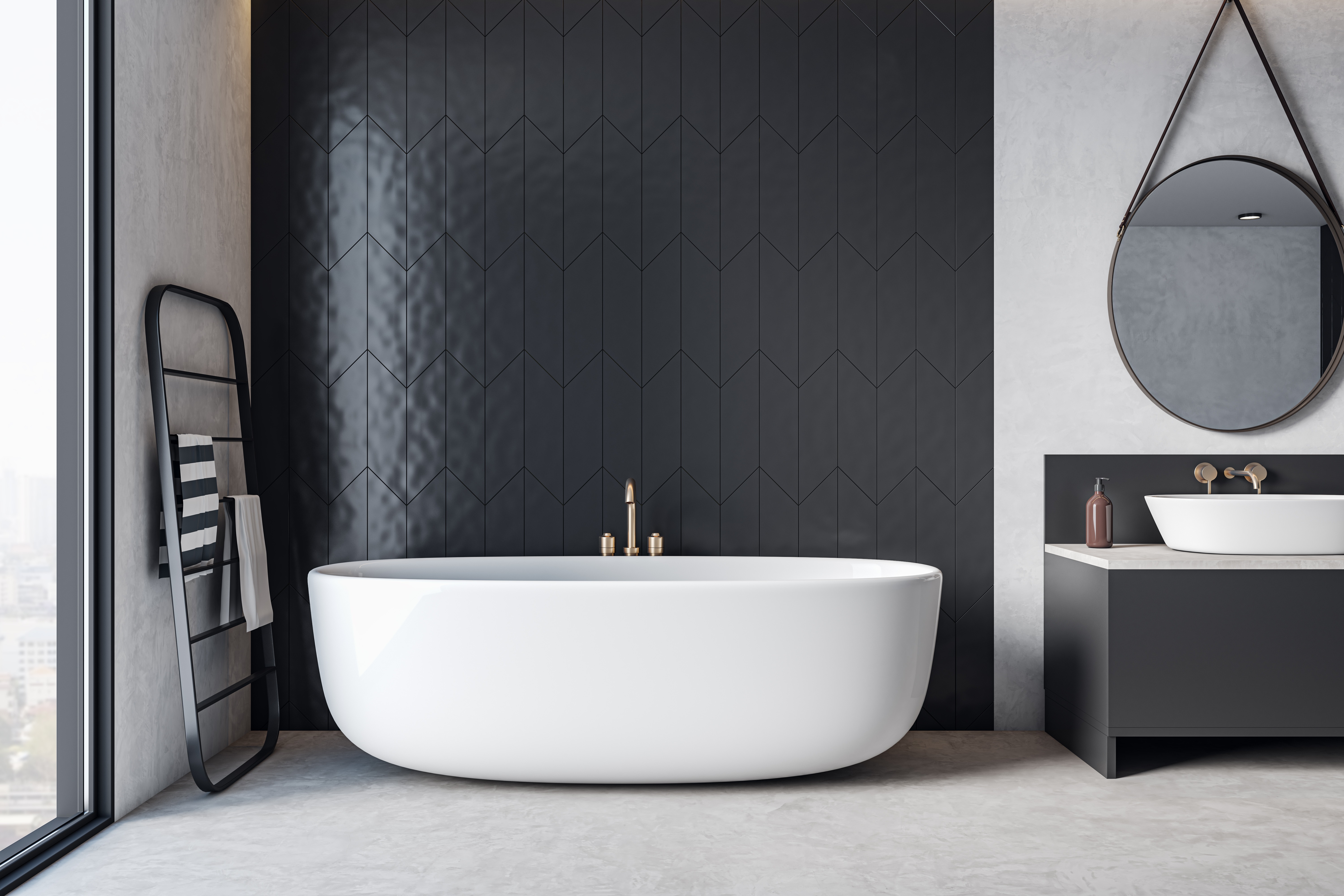 In modernen Badezimmern sieht schwarze Ausstattung sehr attraktiv aus. Beliebt sind sowohl dunkle Waschbecken aus Konglomerat als auch schwarze freistehende Badewannen. Solche Oberflächen sind jedoch schwieriger sauber zu halten, da Ablagerungen leichter sichtbar sind als auf weißer Ausstattung.