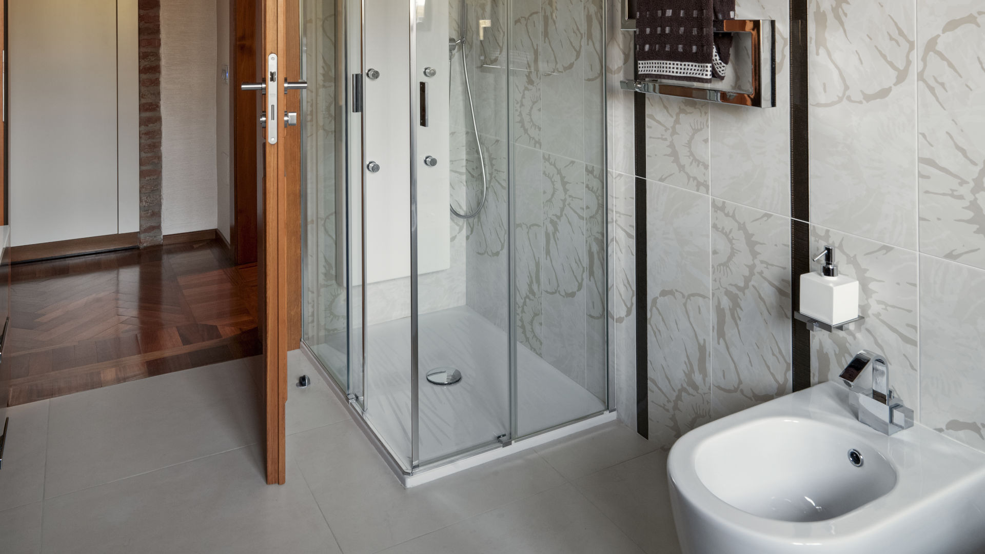 - Große Keramikfliesen ohne Muster schaffen visuell mehr Raum